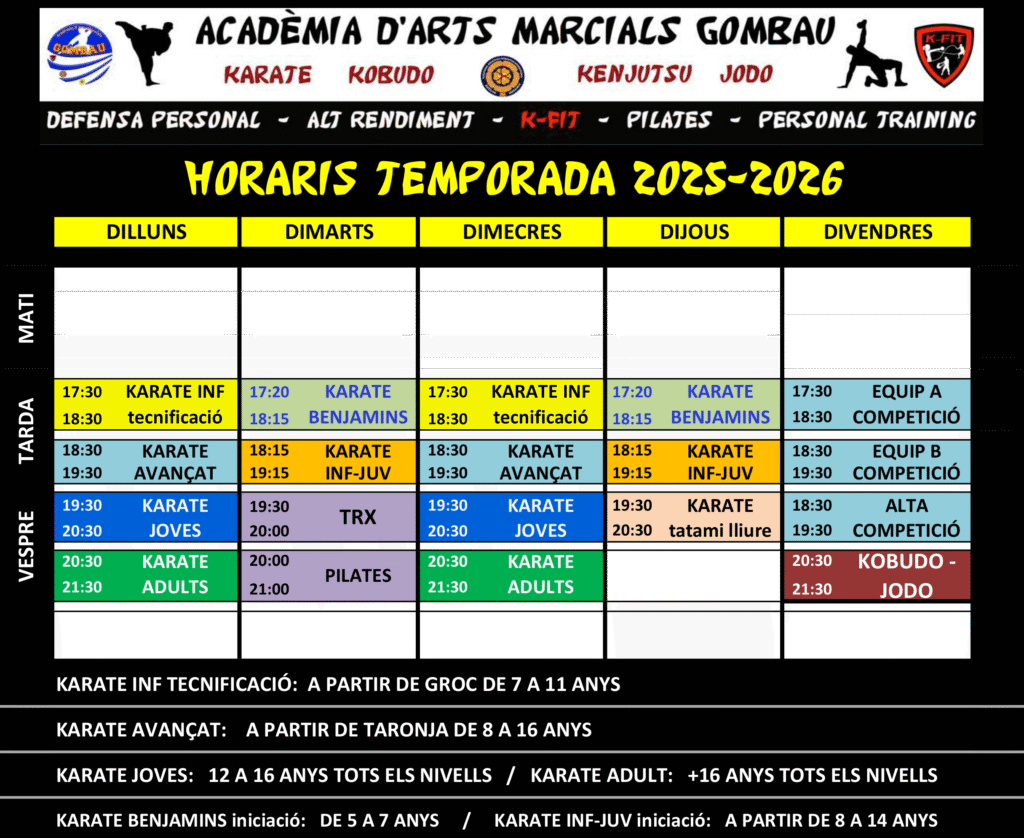 1- Aquí teniu els horaris de l’Acadèmia d’Arts Marcials Gombau a la Seu d’Urgell